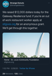 Businesses that can do so can also take advantage of the opportunity to give back. Bockman and the Strange Donuts team have donated funds to the Gateway Resilience Fund and have partnered with other local businesses to sell one another’s products.